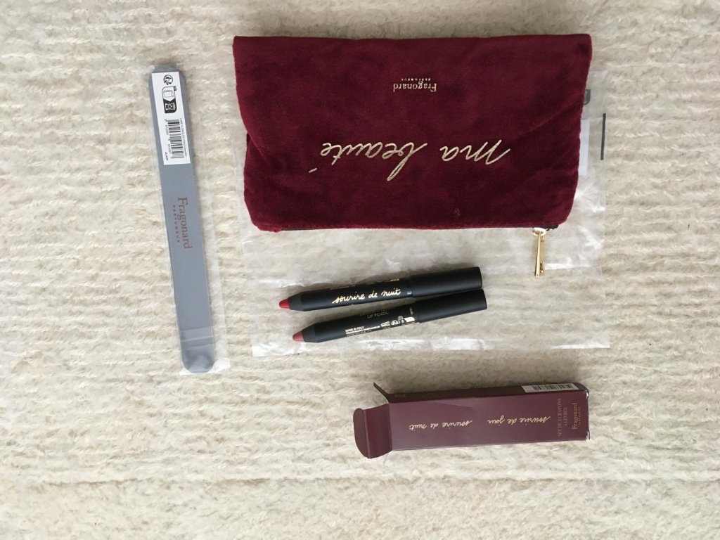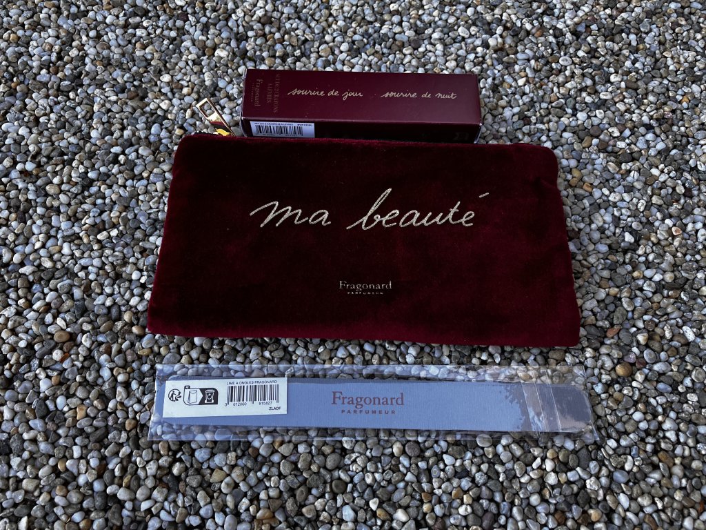 Kosmetická taštička Fragonard z vínového sametu Ma beauté se zrcátkem , pilníkem na nehty a liplinery.