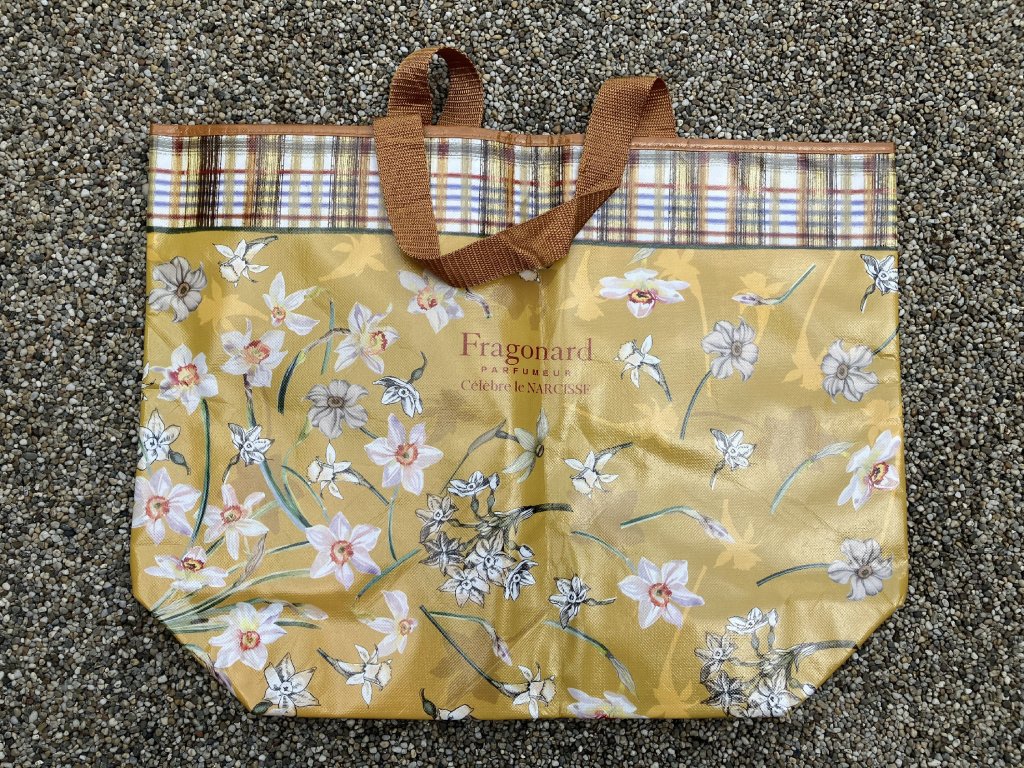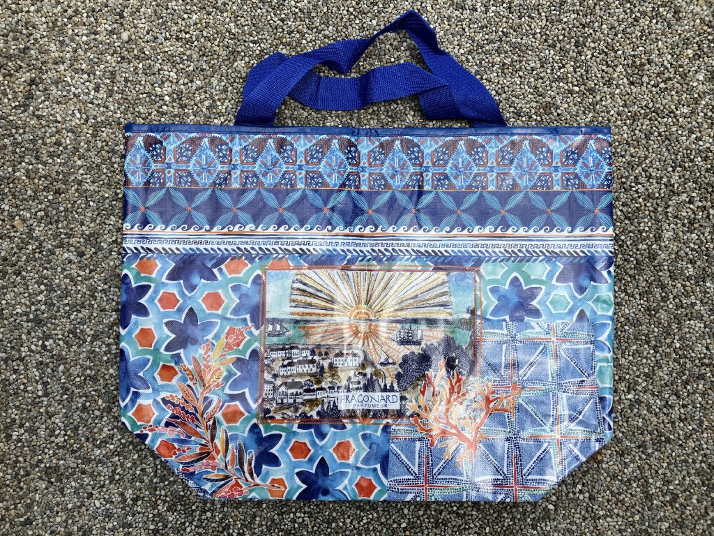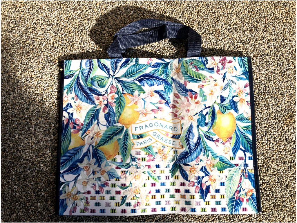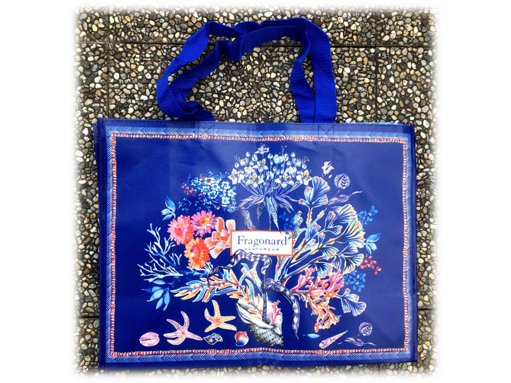Nákupní taška z limitované kolekce Fragonard design v provedení toaletních vod Fragonard. Materiál je plast a ucha jsou pevně přišitá a látková. Rozměry: Menší varianta 48 cm (šířka) x 35 cm (výška) a varianta větší cca 55 cm x 40 cm.