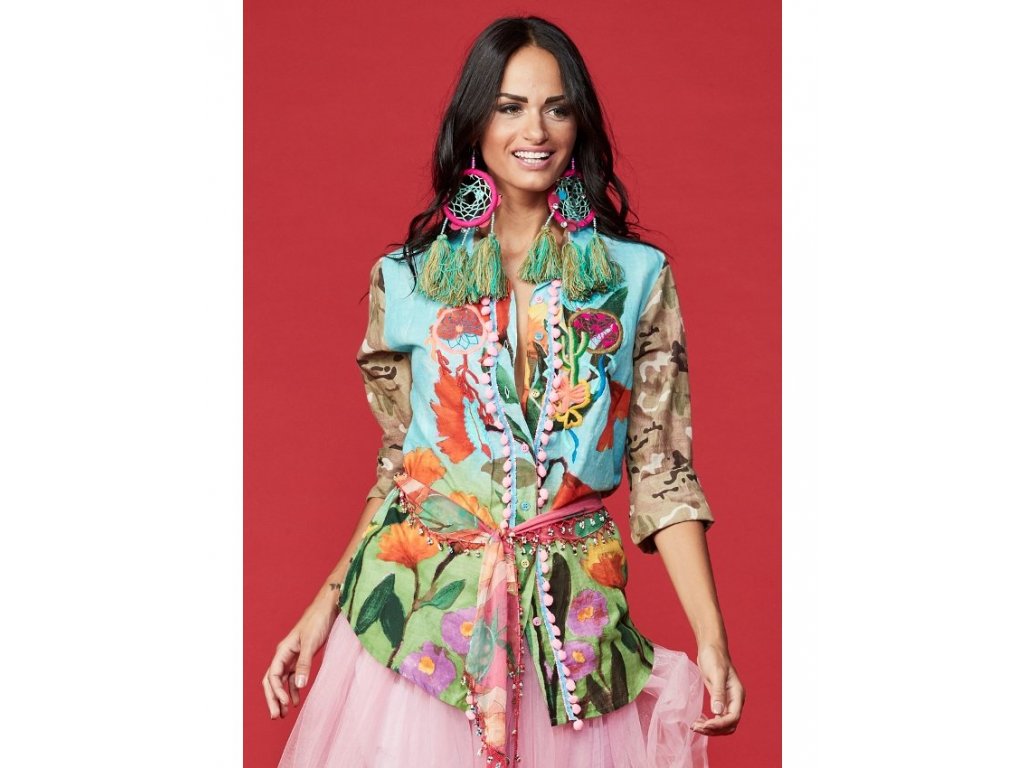 Letní košile - modrozelená s barevnými květy a výšivkami. Originalitu této košile podtrhnou rukávy se vzorem maskáčů.