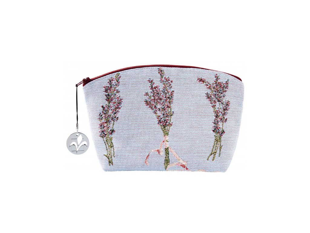 Tkaná gobelínová taštička, se zipem a s motivem levandule a flakónů s parfémem, vhodná např. na dekorativní kosmetiku, uvnitř je lesklá látka s logem. Rozměry ( š x v): 20 x 15 cm.