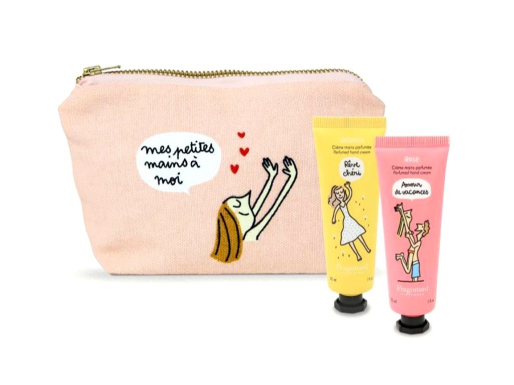 Kosmetická taštička z příjemné růžové bavlny s potiskem navržená francouzskou ilustrátorkou Soledad Bravi obsahuje dva hydratační krémy na ruce s vůní růže a jasmínu.